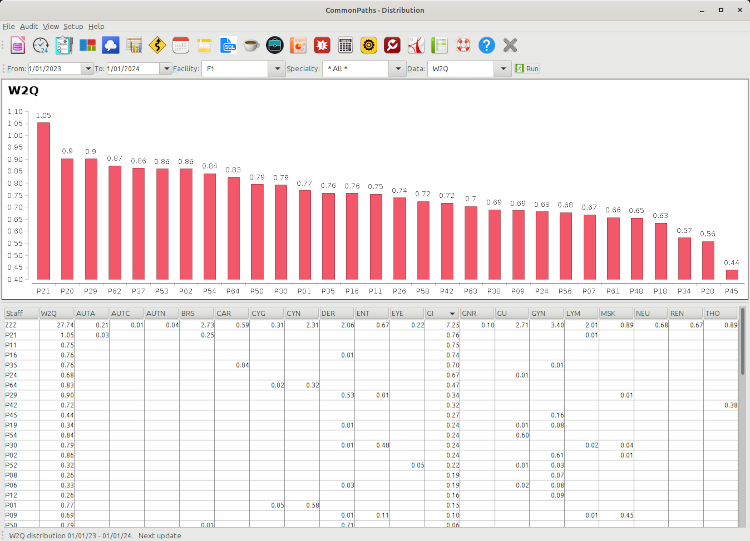 The distribution report shows the breakdown of the pathologists workload into the various subspecialties over a user-defined date range. The information is valuable to ensure the schedule is efficient and equitable. You can view the data by cases, specimens, blocks, slides, CAP-L4E, W2Q, RCP-UK, CPT-US and Code5. The default is by cases, which can be changed from the filter menu. It displays the data in a table and a bar chart sorted in descending order. The report can generate daily, weekly, monthly, quarterly and annual reports depending on the date that the cases were finalized.