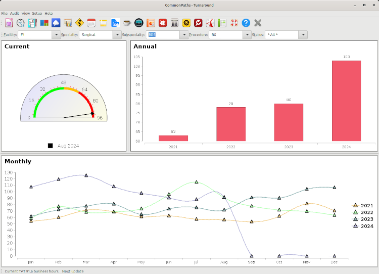 The second toolbar on top of the screen below the main toolbar and above the charts allows you to filter the data by facility, specialty, sub-specialty, procedure or status. The filters are cumulative, so you can select multiple filters at the same time. For example, you can lookup the TAT of a breast biopsy vs a renal biopsy.