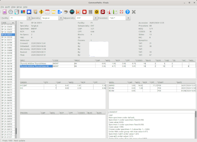The audit report shows finaled cases and their specimens, orders, frozen sections and reviews with their workload units so you can review the coding and make sure it is done properly. The information is displayed in 5 tables, 1 panel and 1 text field: