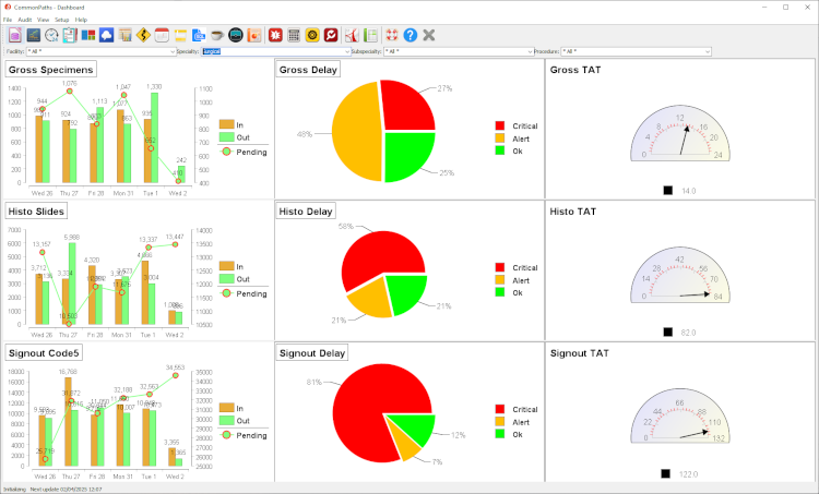 The pie charts in the milddle show the breakdown of cases status into 3 cutoffs: delayed (red), within range (green) and close (amber) to the alloted time. The alloted time for each specimen depends on its urgency and is different for biopsies (shortest) and radical resection specimens (longest)