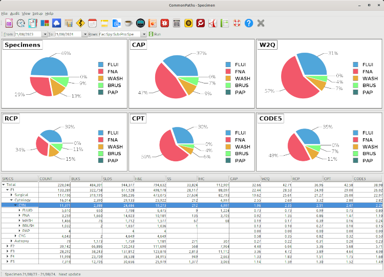The specimens report shows the various metrics that measure workload by specimen, including the frequency, number of blocks, slides, H&E, special stains, IHC, as well as the fulltime equivalence units (FTE) for CAP, W2Q, RCP, CPT and Code5. It is useful for planning and staffing when your hospital is expanding a service like another colonoscopy room or breast center clinic. It displays the data in 6 pie charts that show the breakdown by specimens and the 5 WMS from any row selected from the tree row that you select. The data is displayed in pie charts and a treetable. A treetable shows totals on the top (root), followed by a breakdown hierarchy in the rows (branches), each containing the individual specimens (leaves). To learn how to use a treetable, please refer to this tutorial page.